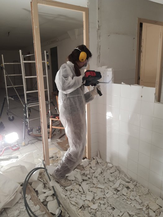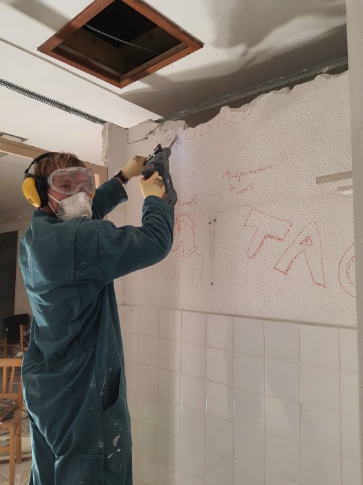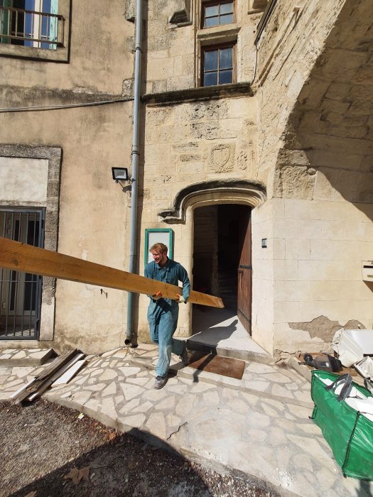 Il a fallu d’abord démonter les toilettes et leurs cloisons au fond de la salle : troquant la philo pour le marteau-piqueur, Pauline et Louis s’y sont attaqués, avant d’ôter le faux-plafond en placo-plâtre et les grosses poutres en bois qui le soutenaient.