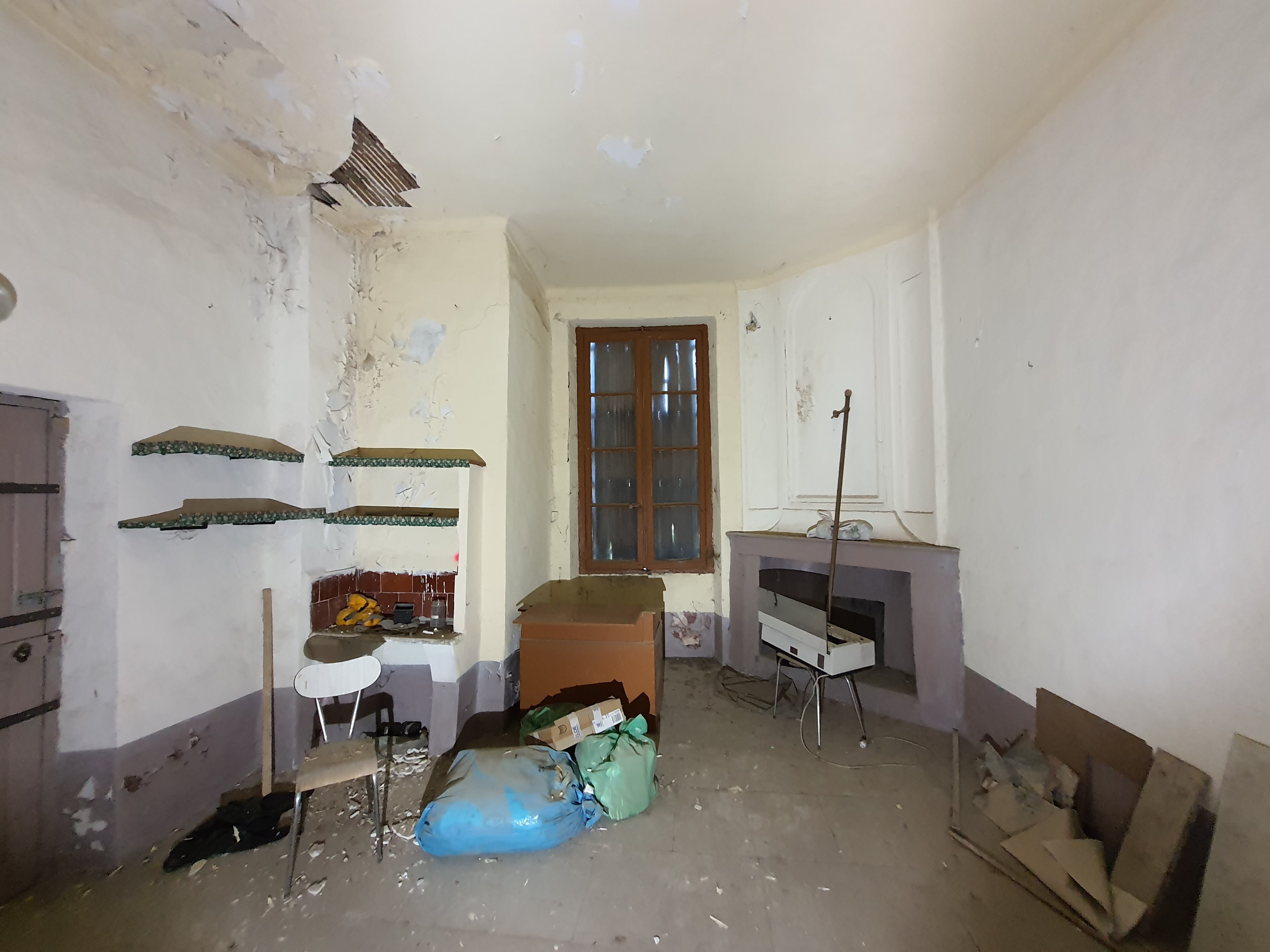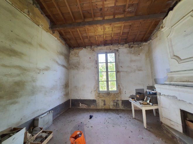 Les deux prochaines chambres se situent au deuxième étage, avec une magnifique vue sur le parc et de beaux volumes, mais aussi sous les toits, ce qui nous incite a être particulièrement attentifs au confort d’été. Le deuxième étage fut pendant longtemps le royaume des pigeons et des "ça peut toujours servir" qui se sont accumulés. L’état des pièces et la taille du couloir de distribution rendent les travaux conséquents.